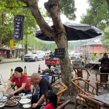 有超過(guò)一百年歷史的彭鎮(zhèn)觀音閣茶館被稱為成都茶館文化的活化石,至今仍保留著不逐豪侈、放松巴適的民間風(fēng)格。它位于雙流區(qū),在一條喧鬧的機(jī)動(dòng)車道黃溫路與安靜的馬市壩街交角不遠(yuǎn)的地方,臨街有瓦頂雨廊,坐在雨廊下,背后是墻上有很多文革宣傳畫(huà)的茶館室內(nèi),前面則是馬市壩街,可以望見(jiàn)黃溫路,因此時(shí)可聽(tīng)到車聲。茶館緊挨著一個(gè)鋁匠鋪,因而又能聽(tīng)見(jiàn)其敲擊聲。再有就是本地說(shuō)著方言的街坊和外地說(shuō)著普通話的游人。竹椅移動(dòng)的聲音如同爆竹,蓋碗茶蓋與碗刮劃的聲音也雜于其中。茶博士穿著藍(lán)色工衣,頭戴時(shí)新的耳筒,可能是一邊工作一邊聽(tīng)音樂(lè),也可能是被網(wǎng)紅打卡地的名聲塑造成這個(gè)樣子。一碗茶加一袋帶殼干花生只需15元,想坐多久就多久。錄音時(shí)間:2021年8月31日;錄音器材:ZOOM H3-VR