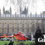 倫敦議會廣場,在伊麗莎白塔旁邊的一條街道上,大本鐘5點(diǎn)敲擊,警察警笛聲,交通,輕微的交談聲